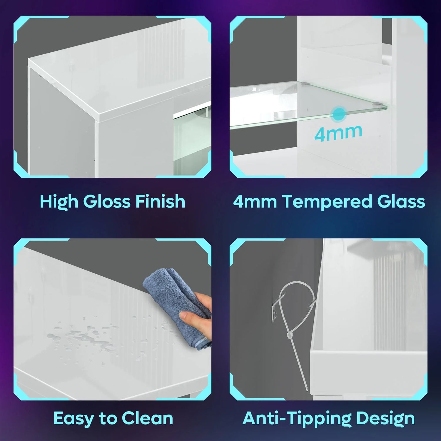 Multiple Storage Spaces: This white TV table offers ample storage space to keep your living area tidy and organized. It features 2 open shelving areas separated by the tempered glass and 2 large side shelves for easy storage to your media devices, DVDs or gamepad, keep your entertainment center clutter-free.