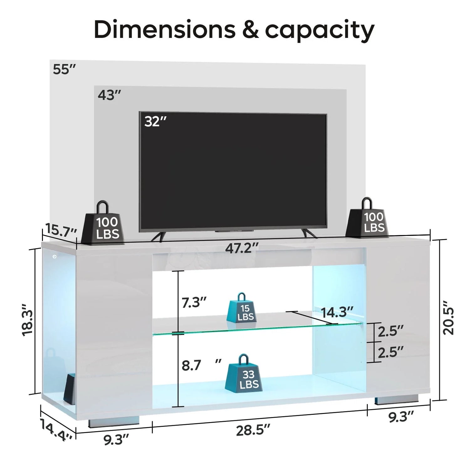 Sturdy & Stable Construction: The 47-inch size of TV cabinet is 47.24"L x 15.67" W x 20.45 "H Crafted from P2 particle board and tempered glass, ensure stability and durability. The top frame of TV console load capacity up to 100lb, providing stable support for your TV and gaming equipment.