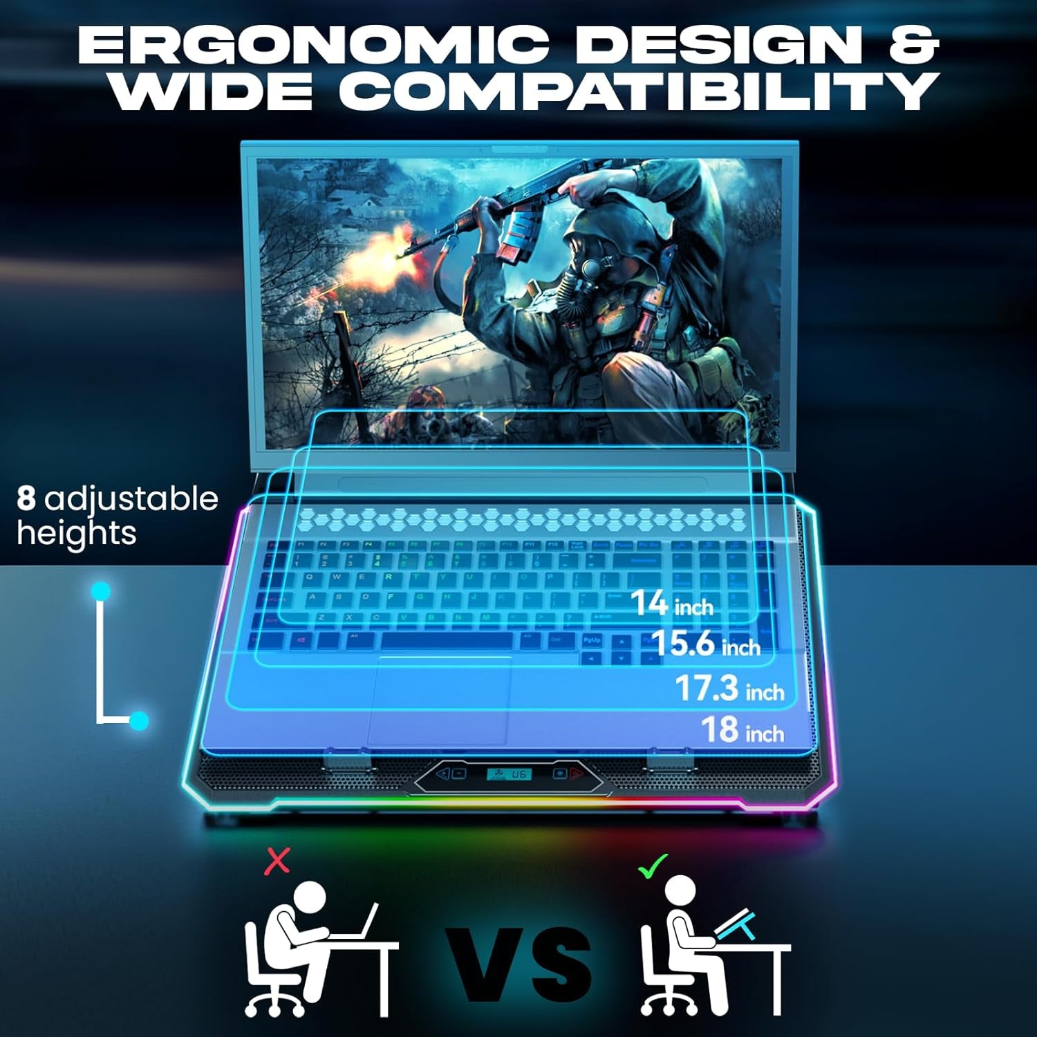• ► RGB LIGHTING & ERGONOMIC DESIGN: Customize your gaming setup with 10 stunning RGB lighting effects. The ergonomic design allows you to adjust the angle for maximum comfort, making it the perfect laptop cooling stand for your desk. Compatible with laptops from 10 to 17 inches. *Note: The lighting can be turned off by pressing the RGB button for 2 seconds.