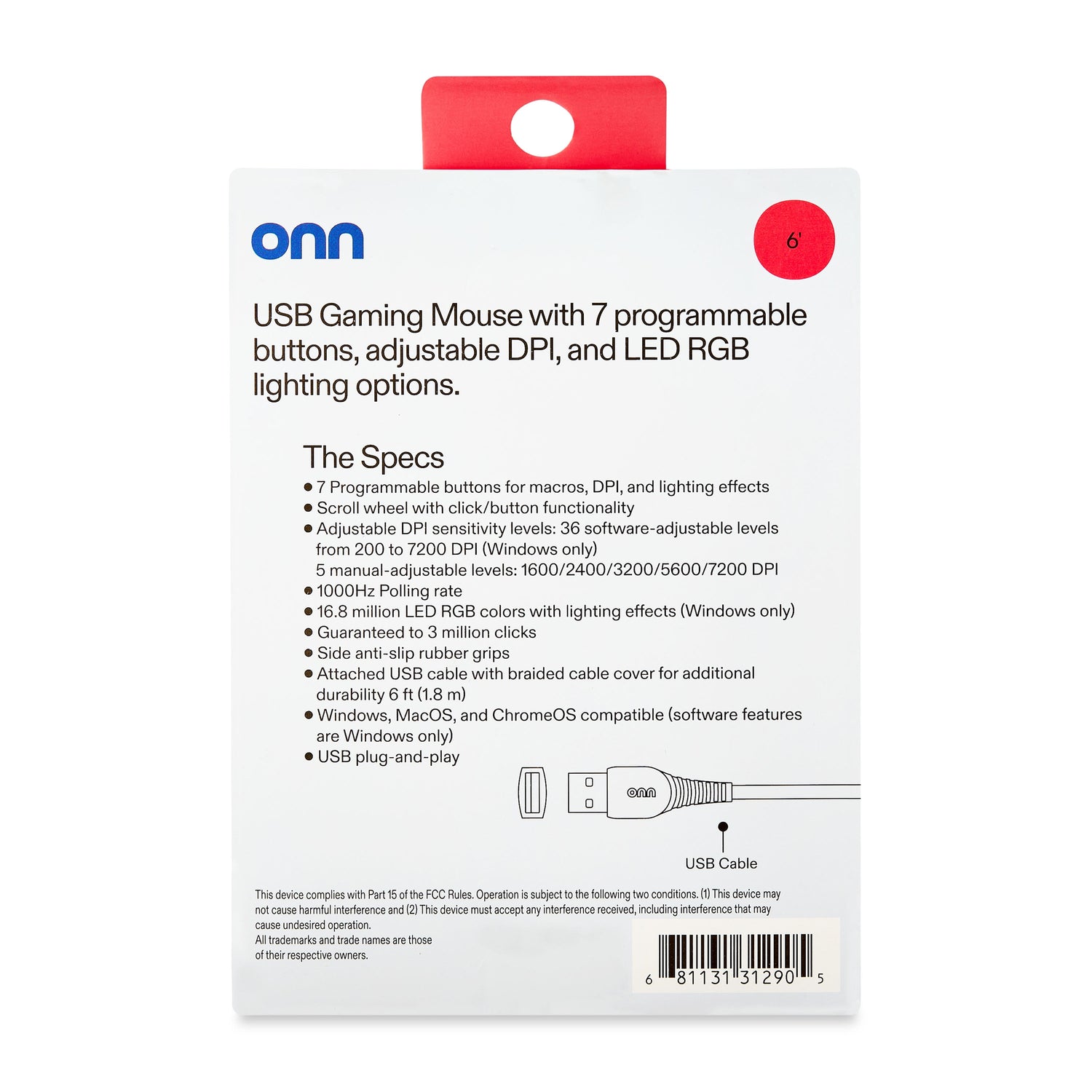 The onn USB Gaming Mouse is a high-performance gaming mouse designed for gamers who demand precision and customization. With 7 programmable buttons, you can assign macros, adjust DPI, and control lighting effects to your liking. The mouse features adjustable DPI sensitivity levels, with 36 software-adjustable levels from 200 to 7200 DPI on Windows, and 5 manual-adjustable levels: 1600/2400/3200/5600/7200 DPI. The mouse also boasts a 1000Hz polling rate, 16.8 million LED RGB colors with lighting effects on Windows, and a guaranteed 3 million clicks. Additionally, the mouse features side anti-slip rubber grips and an attached 6' USB cable with a braided cable cover for added durability. The onn USB Gaming Mouse is compatible with Windows, MacOS, and ChromeOS, with software features available only on Windows. Stay connected with the on USB Gaming Mouse.